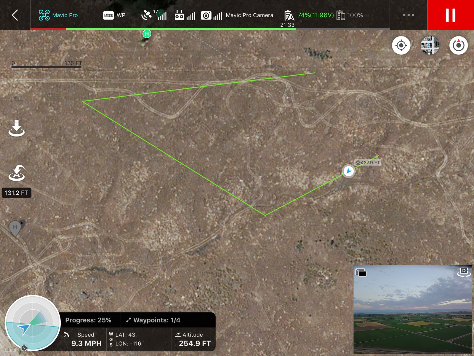 Once you start the mission, the Mavic Pro will ascend to the start point altitude, fly to the start point, and then go fly the mission! What’s left to do is up to how you set things up - if it’s fully automatic, you can kick back and just visually observe your drone flying. In the event of some sort of emergency, the pause button in the upper right will abort the mission, as will the pause button on the remote.