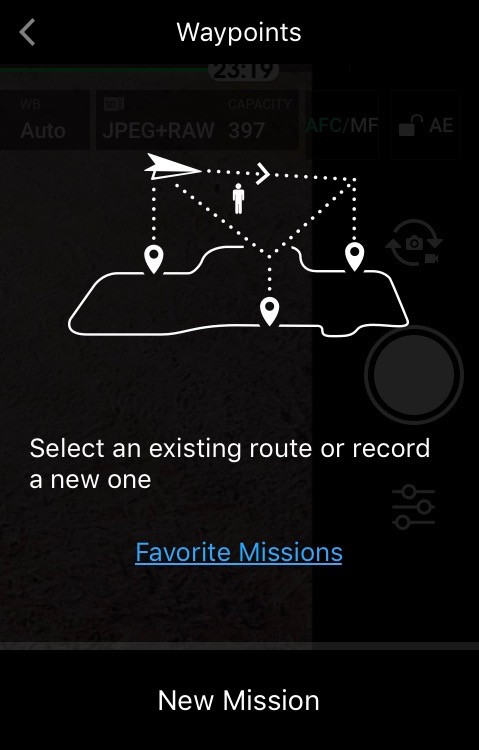 To create a new mission, tap on “New Mission.” This will bring up a new screen for creating a mission. Before you’ve recorded the first waypoint, you’ll see a status screen indicating no waypoints and zero total mission distance - which does make some amount of sense!