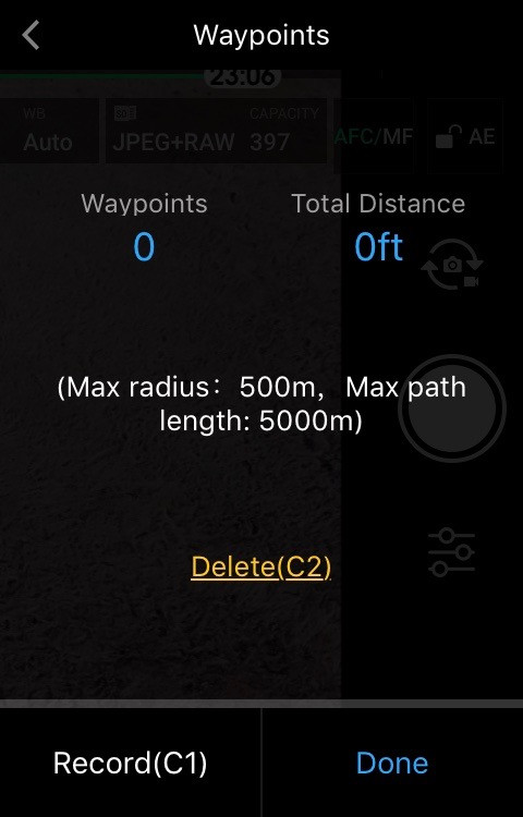 To record waypoints, you can either tap the “Record” button on the screen, or use the C1 button (left button on the bottom of the controller - not the video record button). Personally, I find using the C1 button to be easier as I don’t have to take my hands off the remote. If you don’t like the waypoint you just recorded, you can tap “Delete” or press C2 to remove the most recent waypoint. If you’ve accidentally created a bunch of waypoints at the same spot, you’ll have to remove all of them.