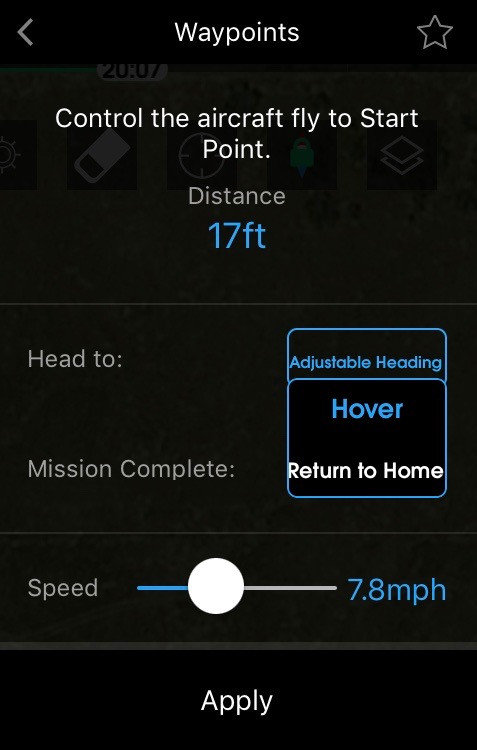 Phrasing here is also a bit weird - “Control the aircraft fly to Start Point” seems to imply that you need to manually fly to the start point, but this isn’t correct. The Mavic Pro will automatically fly straight to the start point before flying the waypoint mission (so, ideally, you should have it somewhere around that point to start with, and a clear path between the current location and the start point).