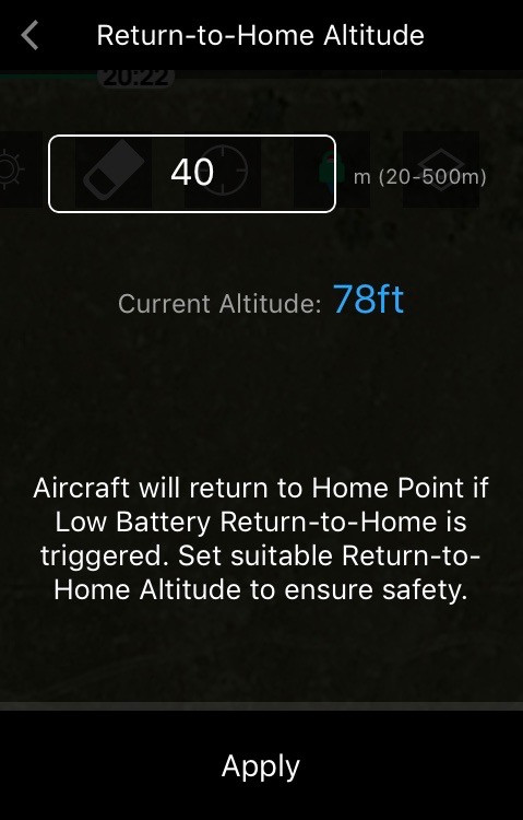 Once you click “Apply,” you proceed to a “Return-to-Home Altitude” screen in which you can set the return to home altitude. This is in meters above your takeoff location - not above the ground, not above the trees. So make sure it’s high enough!