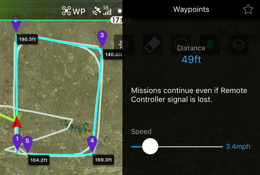 The DJI Go app won’t let you create waypoints outside a 500m (0.3 mile) radius of the home point, or a mission longer than 3 miles (5 km). Since the Mavic Pro is capable of (in ideal conditions) flying 8 miles (13 km) on a battery, this is an abnormally short restriction. However, again, this app isn’t intended to be used for field mapping.