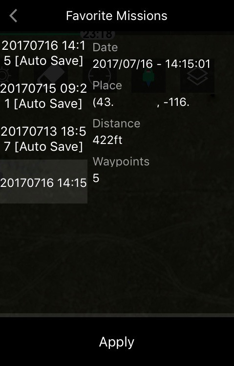 Select a previous mission by clicking on the timestamp on the left (tapping on the right side doesn’t do anything). The missions will show you the date & time you created them, the location, distance, and waypoint count. If you select one and click “Apply,” it brings you to the next screen where you can fly the mission - same as if you’d just created it.
