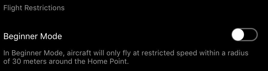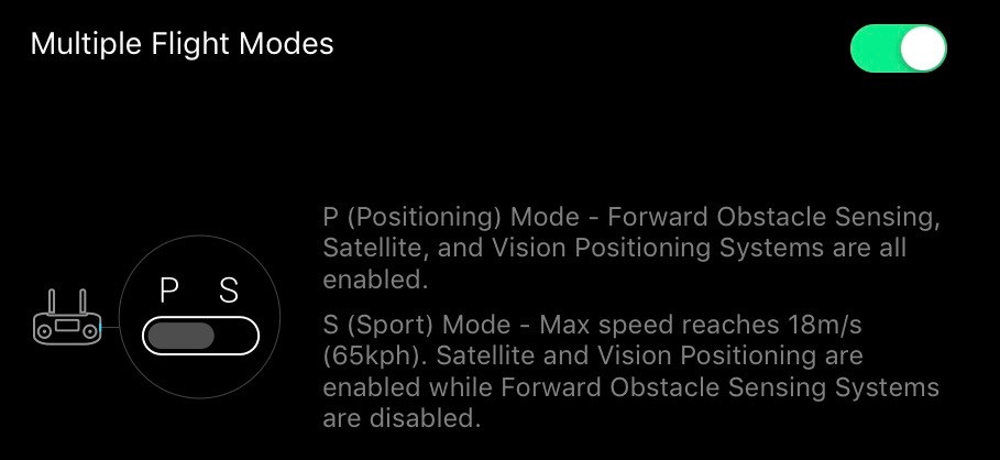 In order to use any of the “Intelligent Flight Modes,” this has to be enabled. Without it, you can’t use any of the extra modes. Sport Mode is considered one of these, as described below. Without this enabled, Sport Mode does not work either - you simply get a warning about being unable to change flight modes.