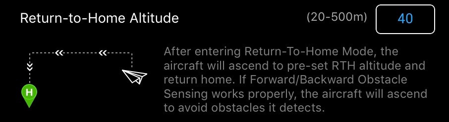 If you specify “Return to Home” as the loss of signal behavior, it’s vital to make sure this is a reasonable value. There’s no real harm in setting it up as high as you’re allowed to fly (120m is a hair under 400’, if you’re in the US).