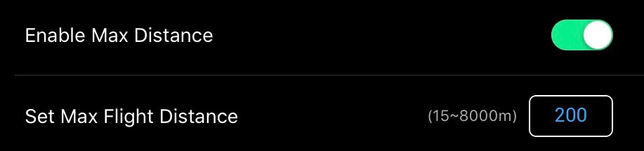 If Max Distance is enabled, a field pops out for setting the maximum distance. This configures the maximum distance from the home point the drone will fly - it refuses to fly further away. Once you learn the maximum range you can see your drone reliably, this will help ensure you don’t fly beyond that range. It’s also helpful if you are flying near controlled airspace - setting it to the distance between you and the surface airspace will prevent you from flying into the controlled airspace by mistake.