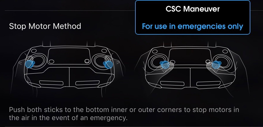 This option determines when the CSC (Combination Stick Command) command will turn off the motors: “For use in emergencies only,” or “CSC Maneuver” Unless you have a desire to turn the motors off in midair (for rapid and extremely unwise descents), leave this in the “emergency” setting. Nobody actually knows what qualifies as an emergency, but it means that in normal operation, pulling the sticks down and together won’t turn off the motors. It will in the “CSC Maneuver” setting. That’s probably a bad idea.