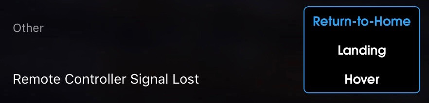 What happens when the Mavic Pro and your remote suddenly stop talking? Well, it depends on this setting! There are three options here: “Return-to-Home,” “Landing,” and “Hover.” They’re pretty self describing. Of these, “Return-to-Home” and “Hover” are the most useful. Landing wherever it happens to be is likely to end poorly, even with the downward firing vision sensors working. I tend to leave this on Return-to-Home and make sure my RTH altitude/location is set properly, because if I’ve lost connection due to interference, coming back towards me should eventually resolve this. Hovering may be useful in certain situations where you’d then hurry towards the drone, but I consider loss of controller signal an emergency situation and would like it resolved as quickly as possible. This would be one reason to do precision takeoffs regularly - if the controller flat out dies, the Mavic Pro can return to home and land.