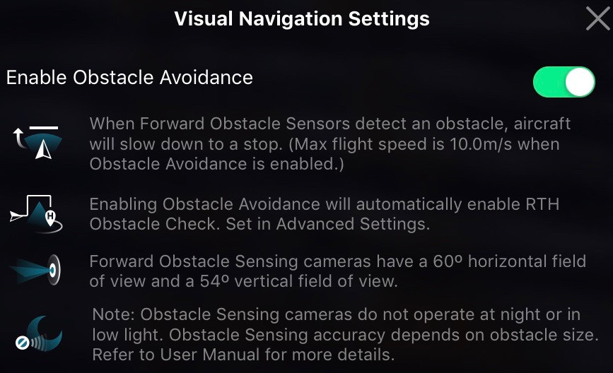 The Visual Navigation Settings menu (the second down) controls obstacle detection and avoidance. This involves the use of the Mavic Pro’s 4 visual positioning cameras (2 facing forward, 2 facing down) and the downward firing ultrasonic sensors to avoid crashing into objects. It also controls, to some extent, what is “permitted” - backwards flying in the Active Track Trace mode, precision landing, checking for a flat surface on landing, etc.