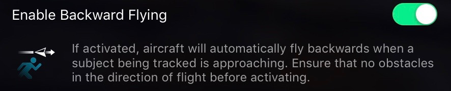 Unfortunately, this does not give you Mater-like skills automatically. This setting impacts the Trace mode in Active Track. If this is turned off and you walk towards the drone in Active Track, it will simply sit there and follow you visually. If this is turned on, the drone will back away from you (in some direction or other). This chances Trace from “drone on a string” to “drone on a stick” - only relevant if you’re closing the distance. I’ve not found this to have an impact in any other mode.