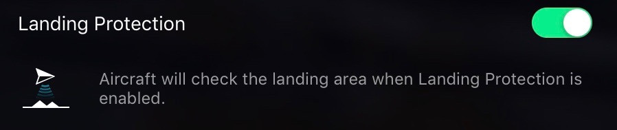 Landing Protection relates to the drone trying not to land on top of something. It scans the surface below and will complain if it doesn’t feel comfortable landing (when in automatic landing mode). If you’re landing manually, this toggle mostly impacts the “minimum height above ground” behavior. I fly onto a raised platform regularly, and if I come in low over the edge, the Mavic Pro will rise to about 2’ above the platform before it lets me land - if this setting is on. If it’s off, I can come straight over the edge at a few inches and plop down without it rising up on me.