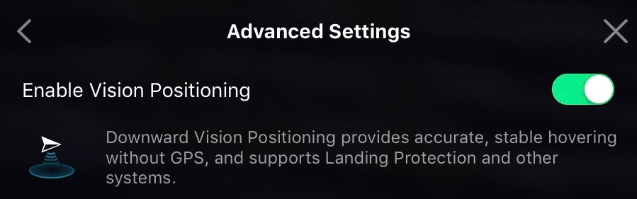 This is the master switch for the downward facing sensors (two cameras and a rangefinder). At low altitude, this allows for incredibly precise hovering - if you’ve wondered why you can park the Mavic Pro in front of you and it just sits there, regardless of wind, this is why. With this disabled, the drone relies on GPS which is significantly less precise for positioning.