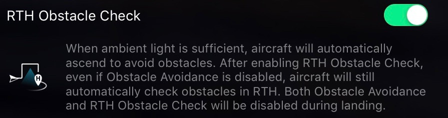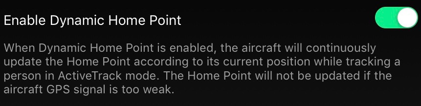 I touch on this more in the post about QuickShot and Dynamic Home point, but this setting, if enabled, will set the home point to the actual aircraft location, every 5-10s, when in Active Track. This is quite useful for “one way” tracking trips where you’re cruising along, following a person/bike/car/etc, and don’t want the drone to turn around to fly back to where you started.