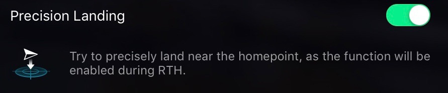 Precision Landing is that super-slick feature where “Return to Home” will land back exactly where you took off. In order to use it, you have to take off and ascend vertically to about 20’, but when it works, it’s incredibly cool. I don’t use the RTH functionality except when playing around, so it doesn’t really matter to me (I don’t trust it to pull off landing on the raised platform), but there’s no real reason I can think of to turn this off.