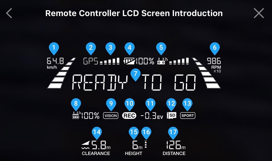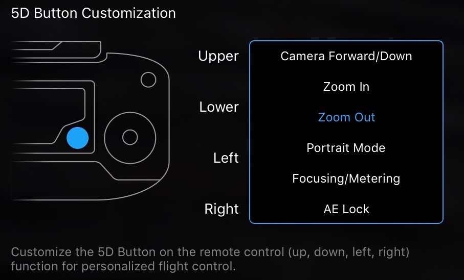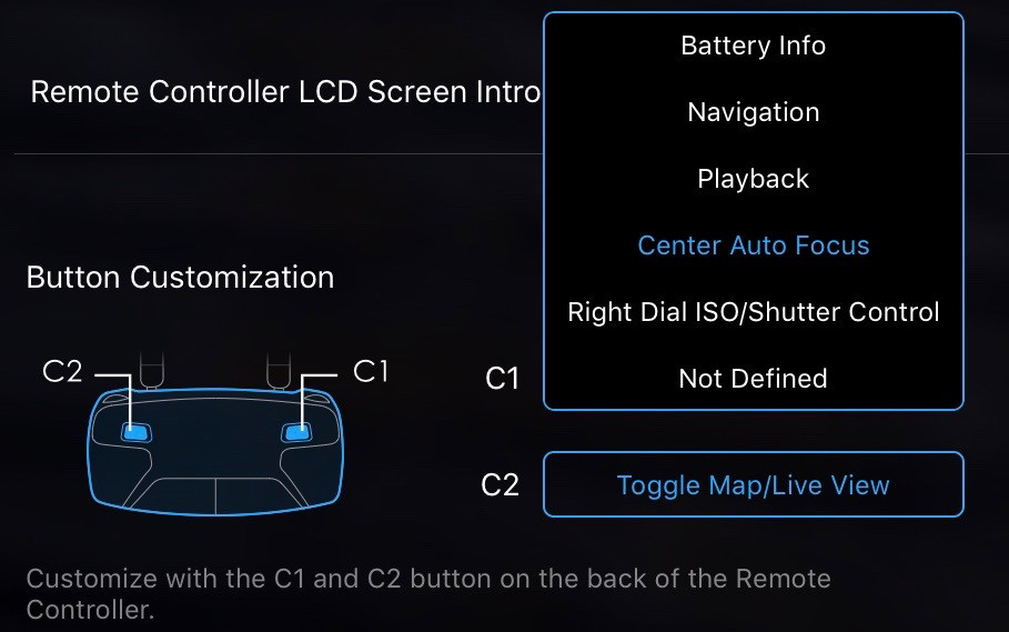 The two Home Point Settings buttons set the home point (for RTH and related functionality) to either the point of the aircraft at the present time, or the location of the controller (assuming the controller has GPS). If you’re not sure where the home point is set, use these buttons!