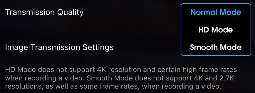 If you’d like, your device can cache video from the drone during shooting. This isn’t the same quality as is recorded on the SD card, but could be useful if you lose your drone and want to trace its steps (or want to access video without having to pull the SD card, which I think only works on Android). This enables that video cache and sets the cache capacity. If you’ve got a lower CPU power device, turning this off may reduce stutter.