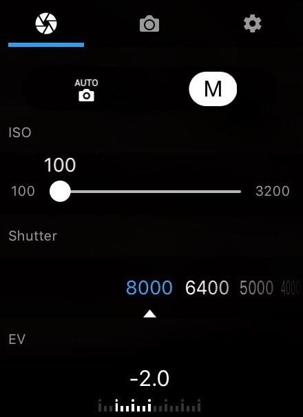 Auto mode, obviously, automatically sets the shutter speed and ISO (and, mostly, sets the ISO to 100 and then sets the shutter speed). In Auto exposure mode, you can set the EV (Exposure Value) correction manually if desired (though the right wheel on the remote also does this and doesn’t require tapping through menus). Setting this to + values brightens the image, and - values darken it. I’ve found that, in general, the Mavic Pro tends to mildly overexpose images in my area (a lot of desert sand and dirt), so I drop things a bit to bring the exposure back to what I like to see.