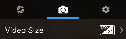 When you tap on a particular resolution, the available framerates appear underneath, with the selected one in blue. Of particular interest, you can shoot 720p at 120fps…