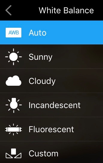Options include “Auto,” “Sunny,” “Cloudy,” “Incandescent,” “Fluorescent,” and “Custom.” I expect that “Sunny” or “Cloudy” will cover most of the Mavic Pro uses.