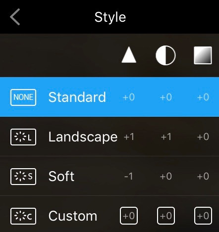 The “Style” menu controls minor post-processing that the Mavic Pro can apply to video and photos.