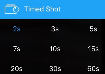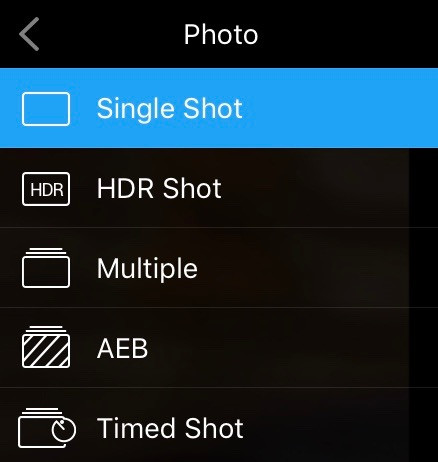 Options are “Single Shot,” “HDR Shot,” “Multiple,” “AEB,” and “Timed Shot.” A better term for “Multiple” would be “Burst,” and “Timed Shot” should be called “Time Lapse.”