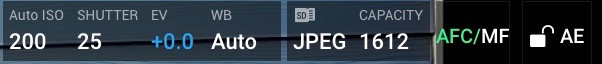 A few settings show up in the viewfinder while shooting - as well as some status information. This overlay shows the camera settings, estimated capacity for current settings, and two toggles. The AFC/MF toggle will switch between autofocus and manual focus (with a slider for setting focus), and the “AE Lock” symbol will lock exposure if tapped.