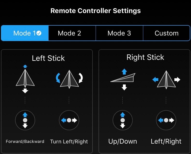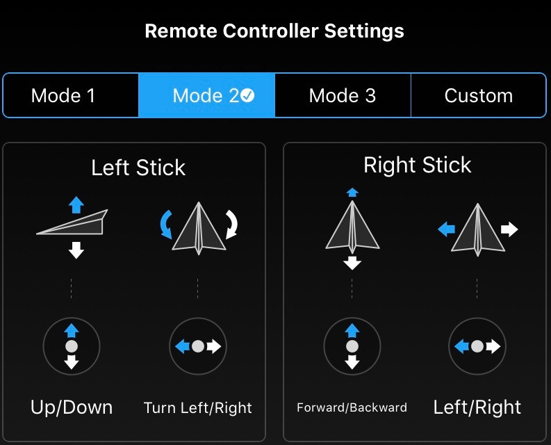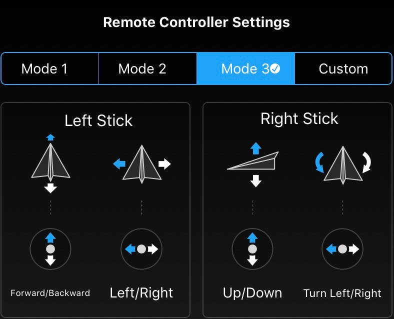 This resets the values for the previous three menus to defaults. If you’ve been playing around and your drone flies weird, tap this and fix everything! Also, lose all your changes.