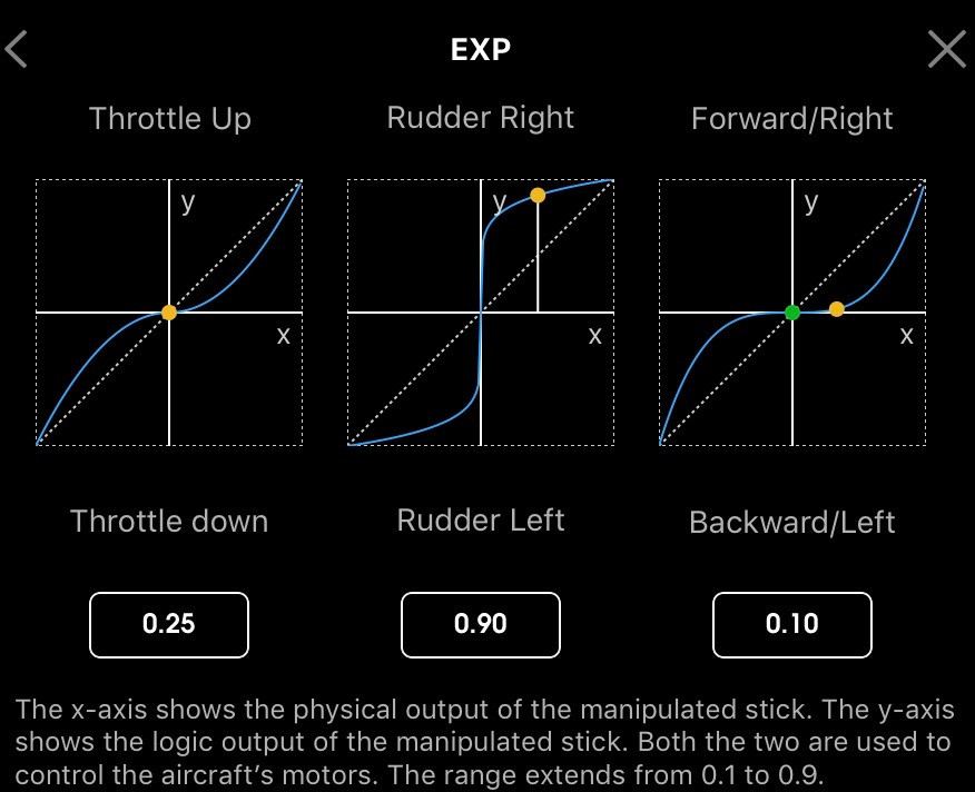Adjust these by tapping on each window and dragging up or down. A value of 0.5 is “perfectly linear” - the requested movement is exactly proportional to the stick movement. Lower values damp the movement near the center of the stick movement (allowing more precise control), and higher values make things more aggressive (small deflections on the stick make for large requested changes in drone performance). The default is 0.25, which is fairly sane.
