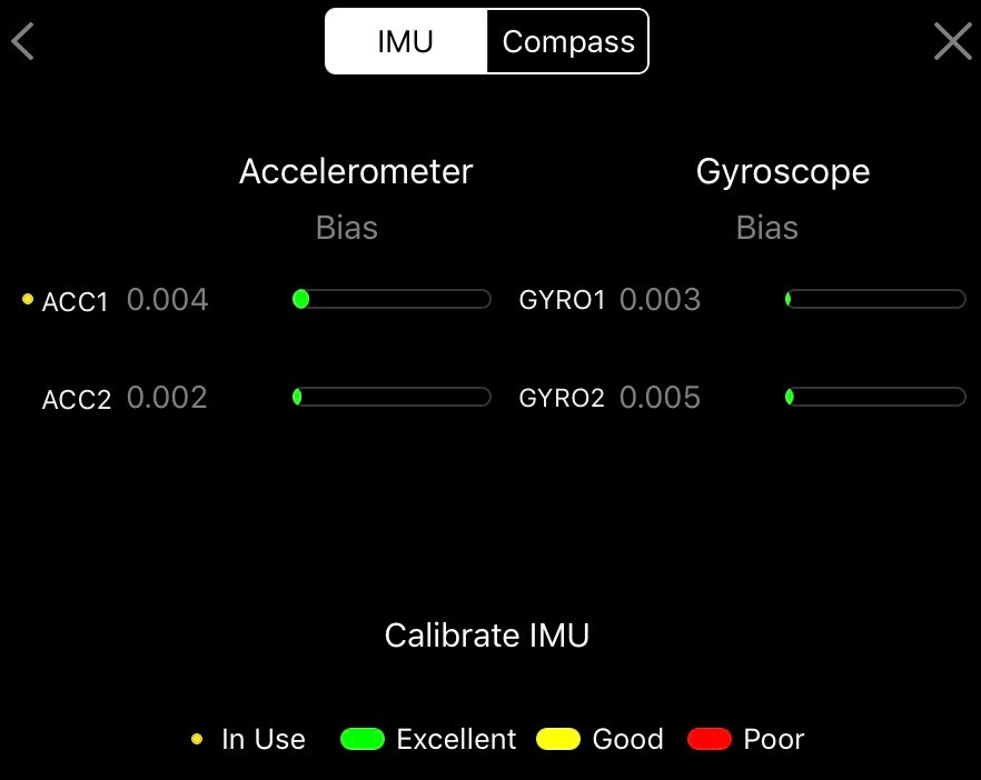 Would you like to find out what your IMU and Compass sensors see in terms of quality of signal? This is your menu! This shows the bias on the IMU (it should be quite low, or you may need to recalibrate), as well as the interference on the compass.