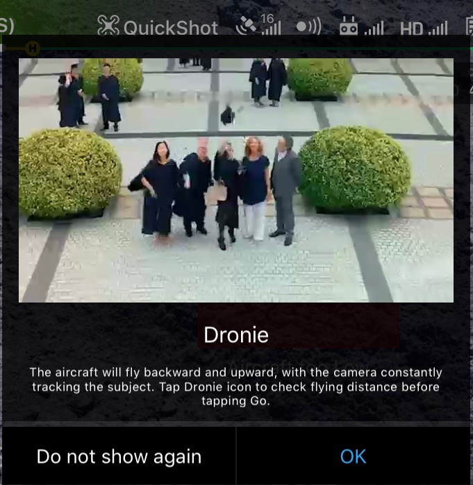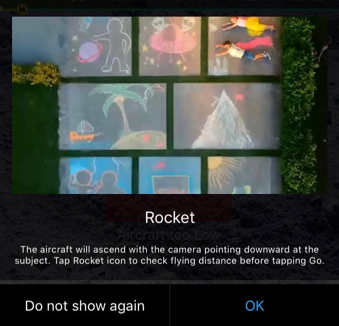 Once you select a target and click “GO,” you’ll see a popup video for the first mode - Dronie. So, let’s look into that mode first.