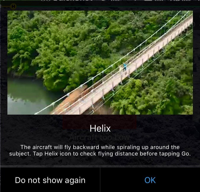 The second option you can pick is “Helix.” Per the description, “The aircraft will fly backward while spiraling up around the subject. Tap Helix icon to check flying distance before tapping Go.”