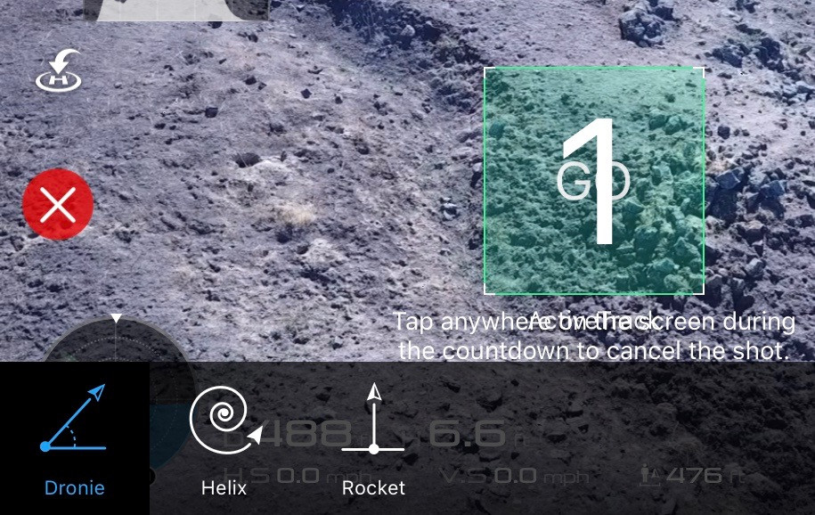 When you’re ready to take your Dronie video, tap “Go.” You’ll get a countdown timer on the screen and through the audio, a bunch of overlapping text, then the drone will fly off to take the video. You can tap the screen during the countdown to cancel the shot, if you change your mind.