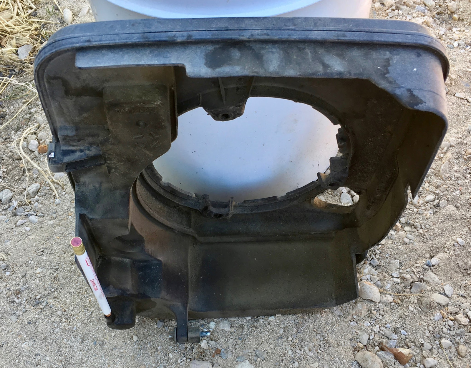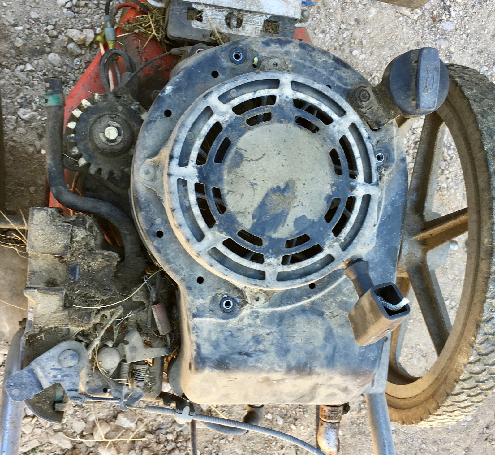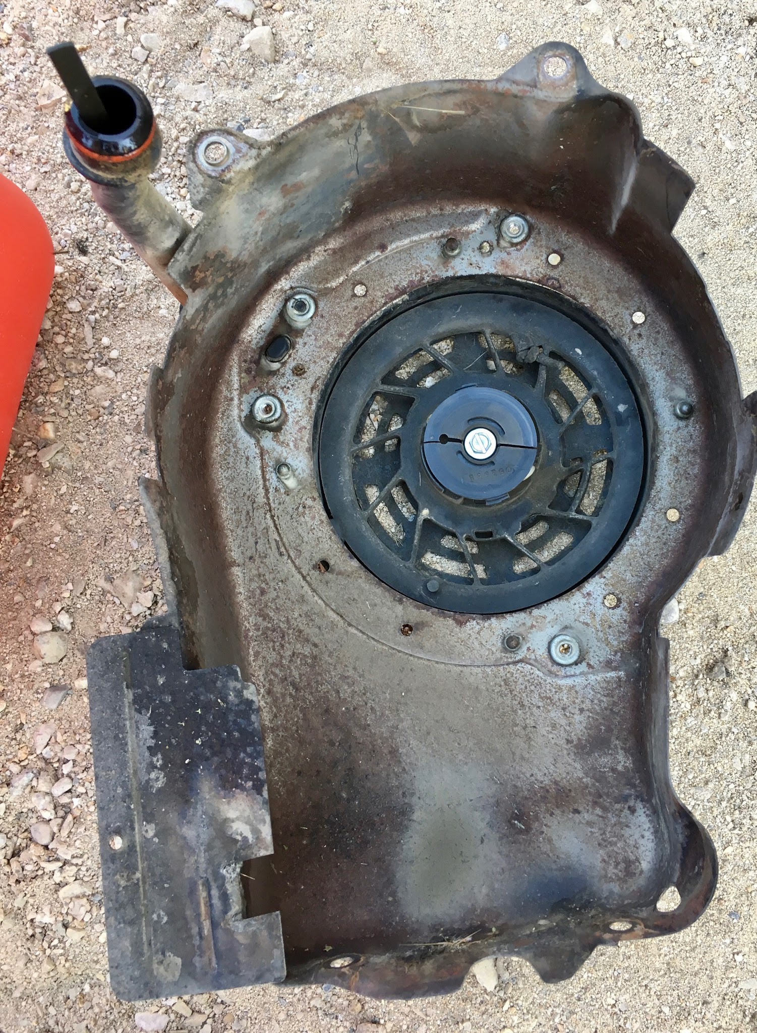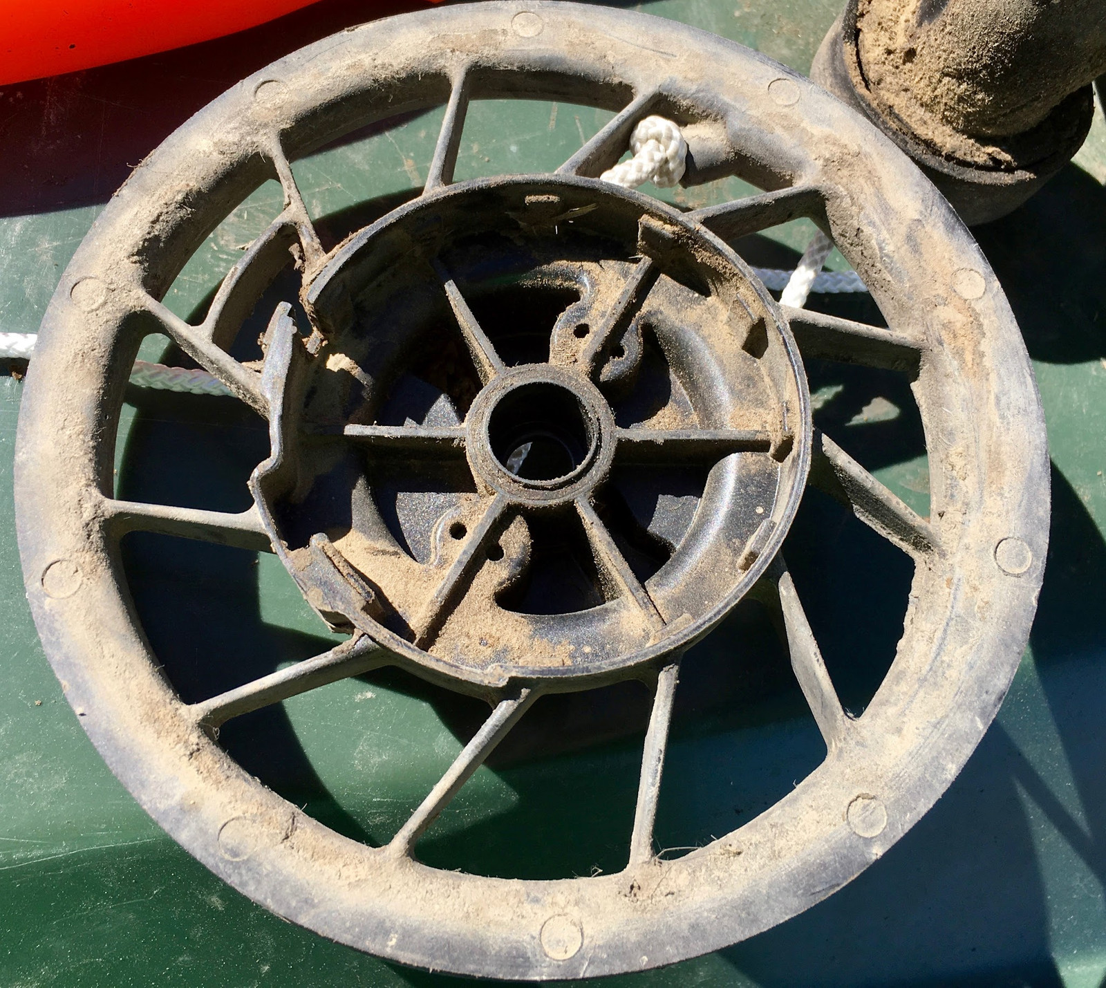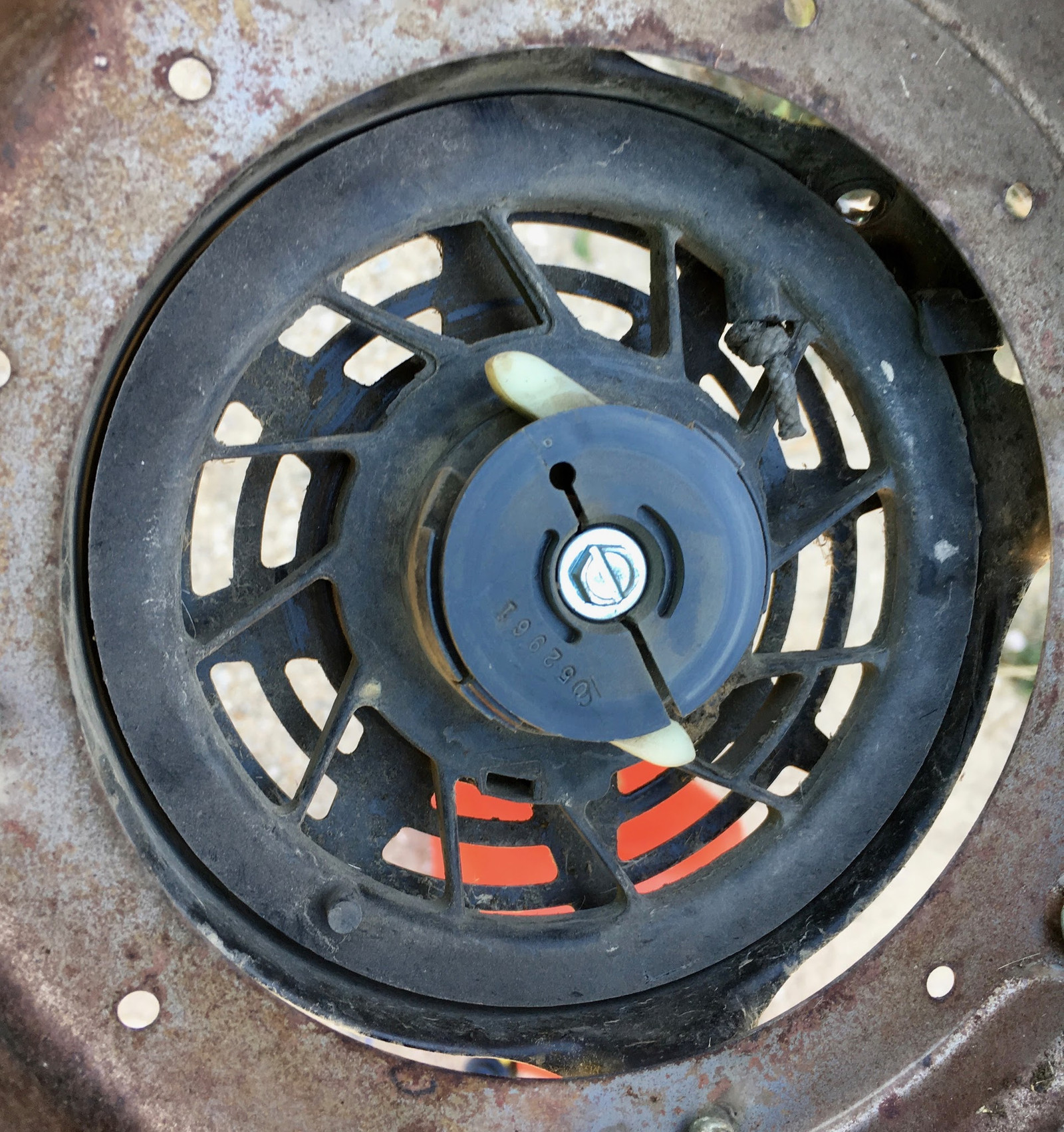 The top part directs air (and a lot of plant bits) to the cooling fins, but also contains the all-important recoil starter assembly. This consists of a large pulley, a rope, a very strong spring, and a one way ratchet.