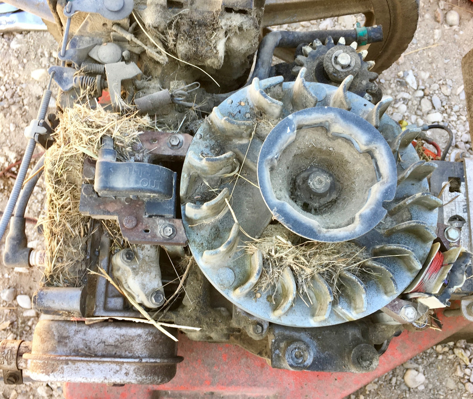 The fins make up the fan that packs grass firmly into the corners of the engine assembly. Theoretically, it’s for cooling air, but I don’t think much air was getting through my cooling fins. Seriously, clean this stuff out.