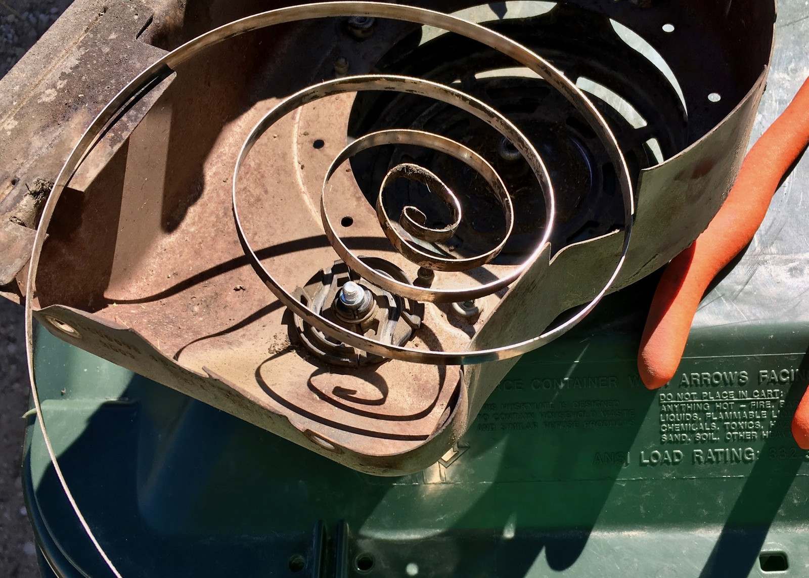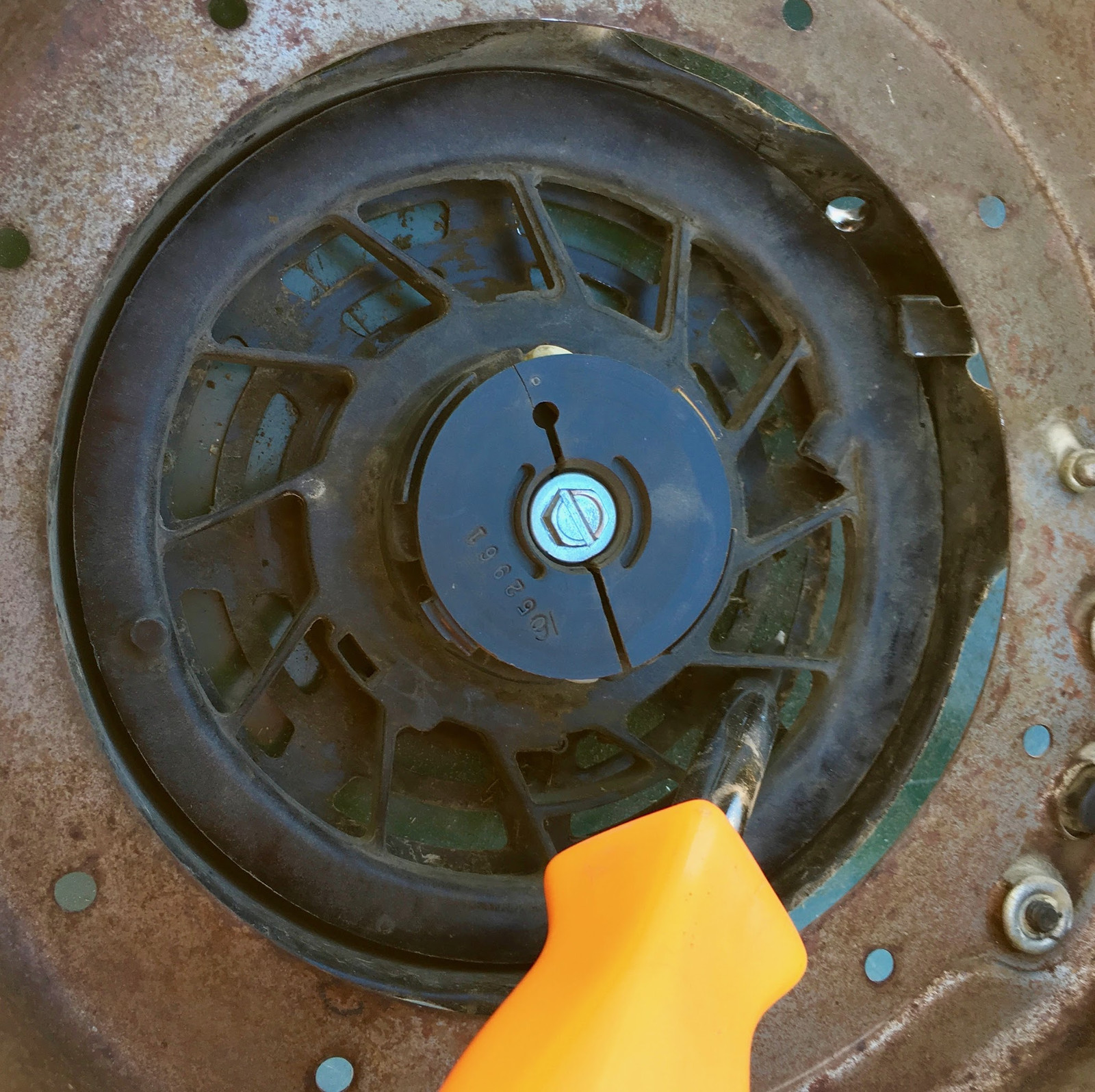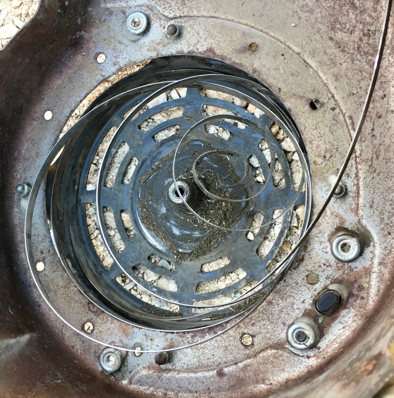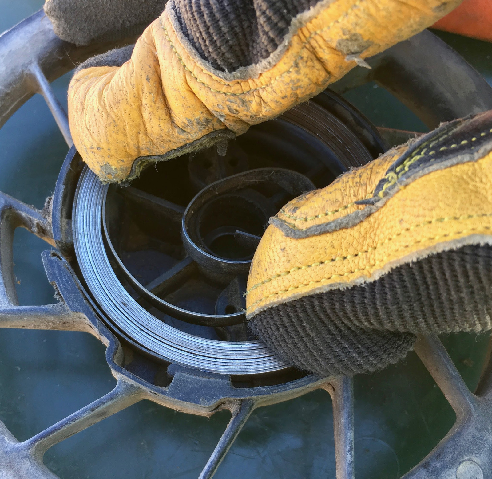 Now, if you read the official instructions, they’ll tell you to use a dental pick or something to fish the rope out, and to absolutely not remove this screw so you can get at the rope (which is almost certainly jammed into the pulley). Well, if that works for you, great. And, if not, you’ll either have to follow the recommended advice (which is to take your engine to a small engine technician for them to work with the spring), or follow my advice, which is to get yourself a long sleeve shirt, possibly a sweatshirt you don’t care about, a heavy pair of gloves (leather is a good idea, but you need more dexterity than welding gloves will offer), and to go in and deal with the spring. It’s not magical, but it does contain enough energy (when wound) to cut you up pretty nicely. It’s basically coiled razorblades and hate - treat it with respect.
