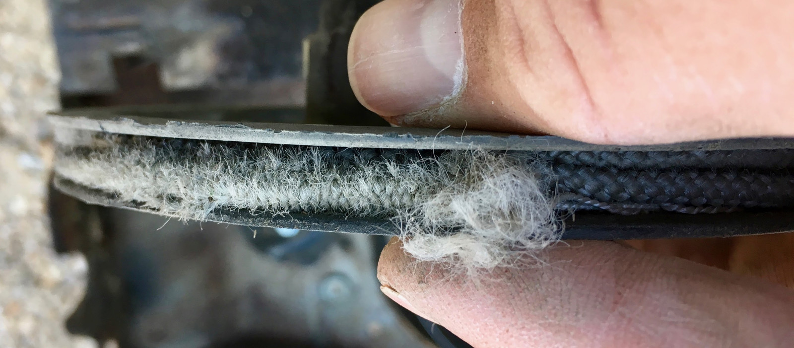 Once the spring has sprung free, pull the pulley out and deal with your torn up rope. For mine, the fibers had wound behind another loop, and it was pretty well wedged in there. There was no way I was going to pull this out without taking the whole assembly apart - I had to pull the rope out with a pair of needle nose pliers. It was quite stuck!