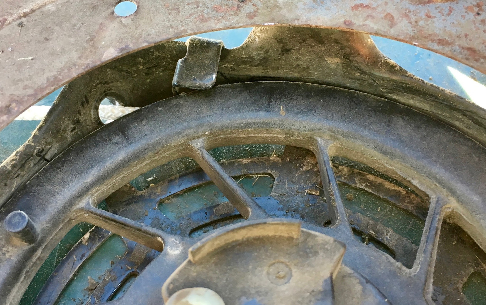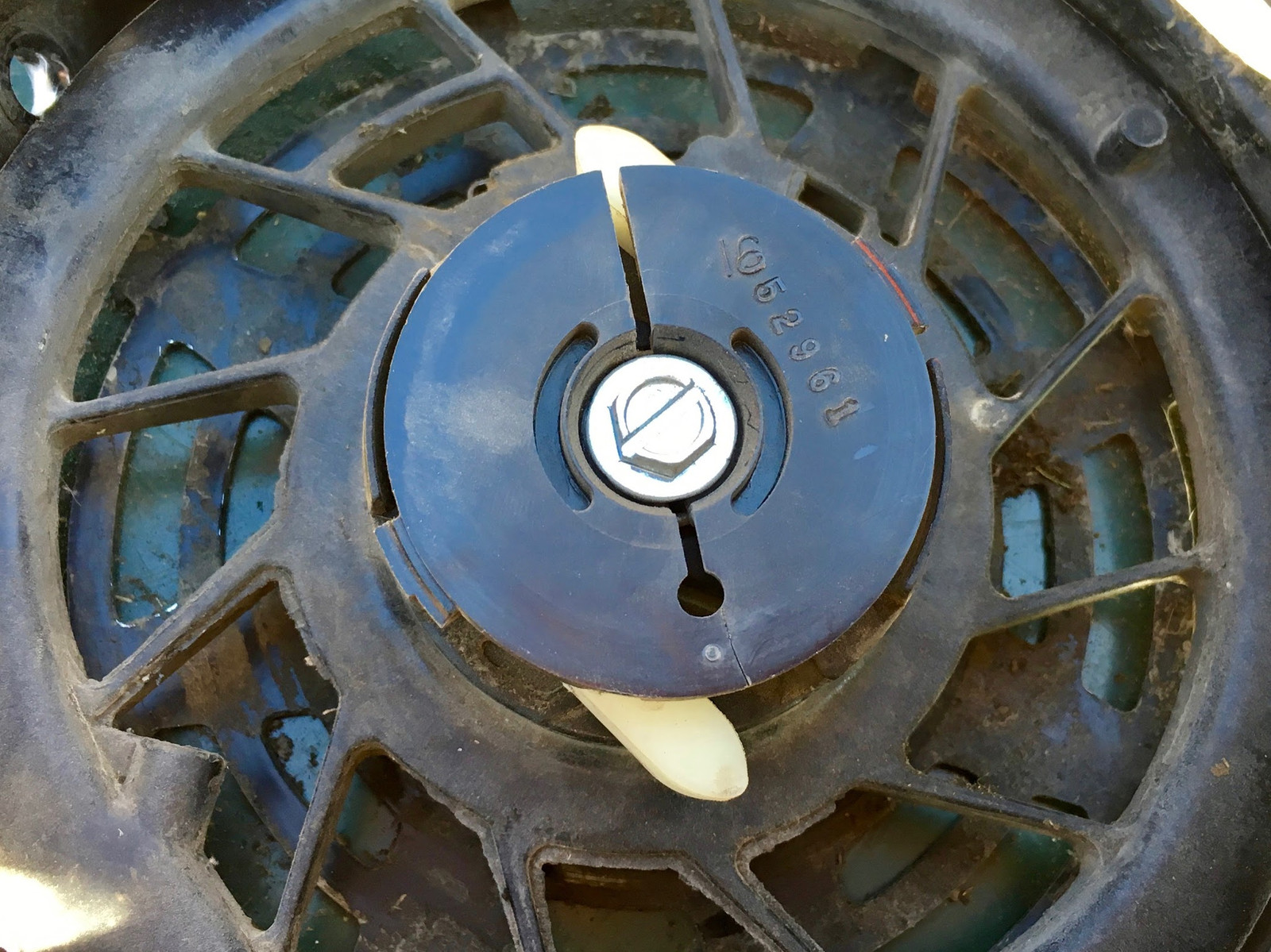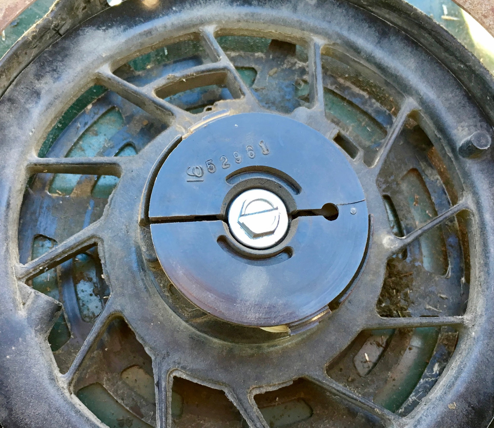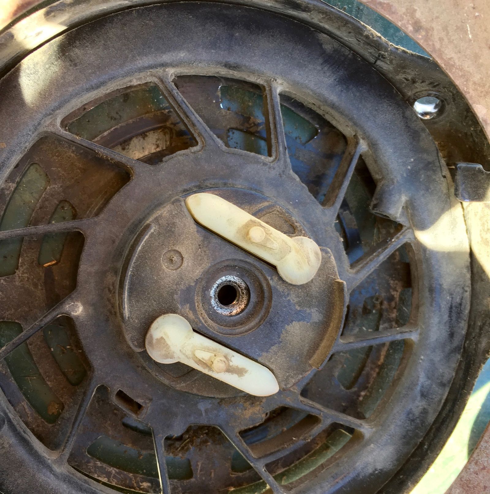 Pull the rope (or spin the pulley, because if you could pull the rope you wouldn’t be this far into the mower), and the one way ratchet pegs extend out. If you look back up at the motor flywheel, you’ll notice four square notches in the stamped metal bit bolted to the flywheel - this engages with those and turns the crank when you try to start the mower! As the pulley winds the rope back in, these tuck back inside and stay out of the way.