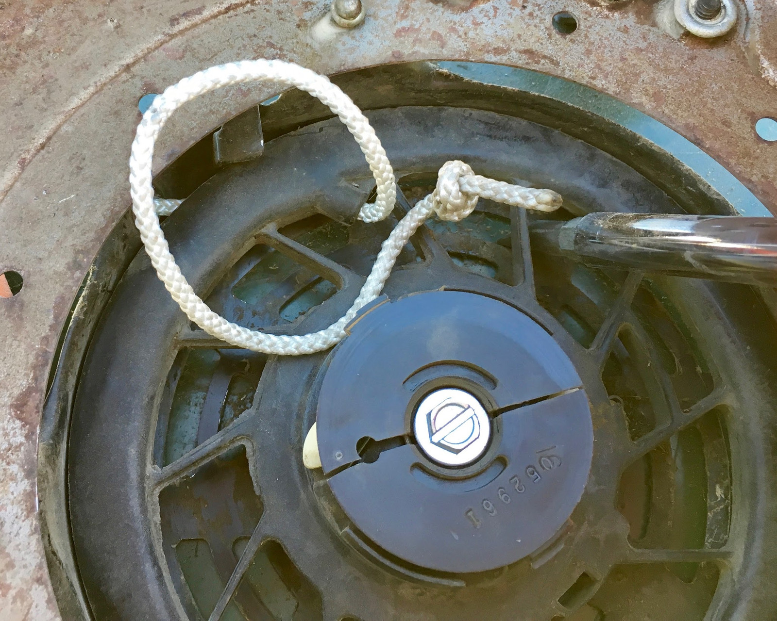 Now, carefully remove your screwdriver, vice grips, or whatever, and let the rope wind in fully. It should fully retract and be tight against the housing, but not overly tight. Basically, it should feel normal for your engine - if not, redo it with more or fewer twists. One twist too tight is probably better than one twist too loose (the rope bouncing around inside is likely to tangle eventually). And that ends the dangerous bits you’re not supposed to do!