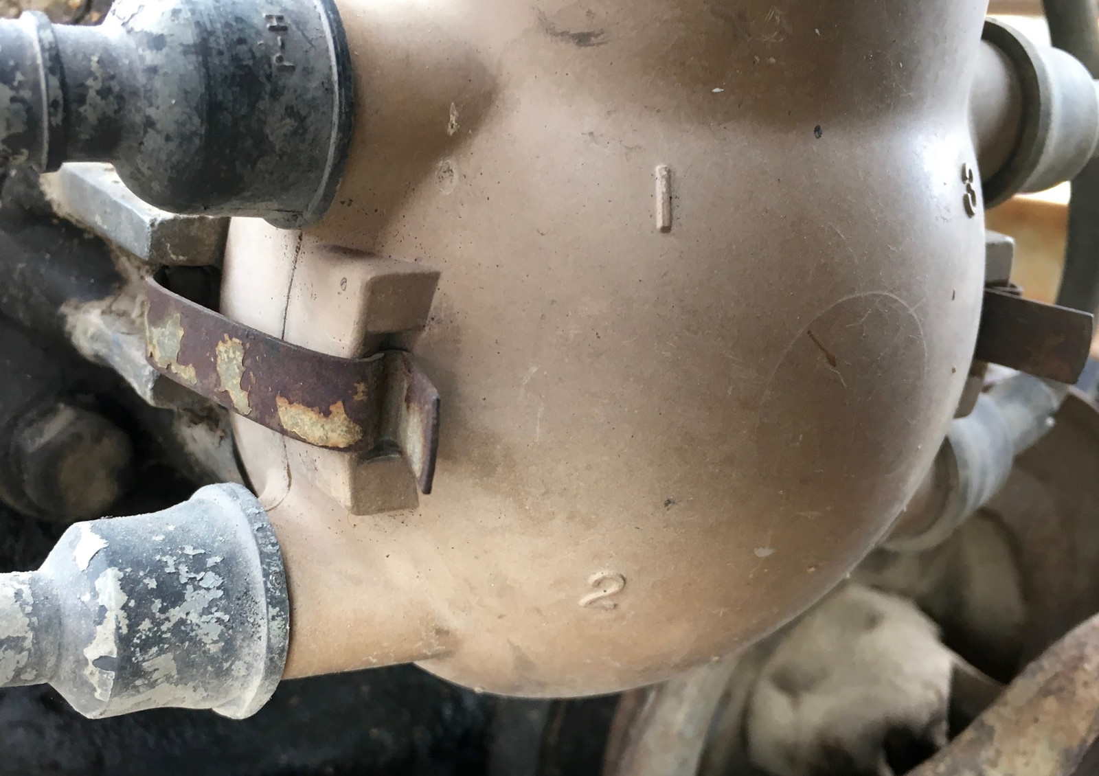 There’s a nice metal tube along the engine that carries all the electrical wires that go between the front of the engine and the back. This includes four spark plug wires, power to the points and ignition coil, and the charging line from the generator. Those of you with some EE background may be cringing at this point about the ignition wires running parallel to the charging wires and such - and your cringing is entirely correct. But I’ll touch on that later. For now, it’s sufficient to notice that the plug wires come out of the tube at each cylinder, and they come out the front of the tube by the distributor.