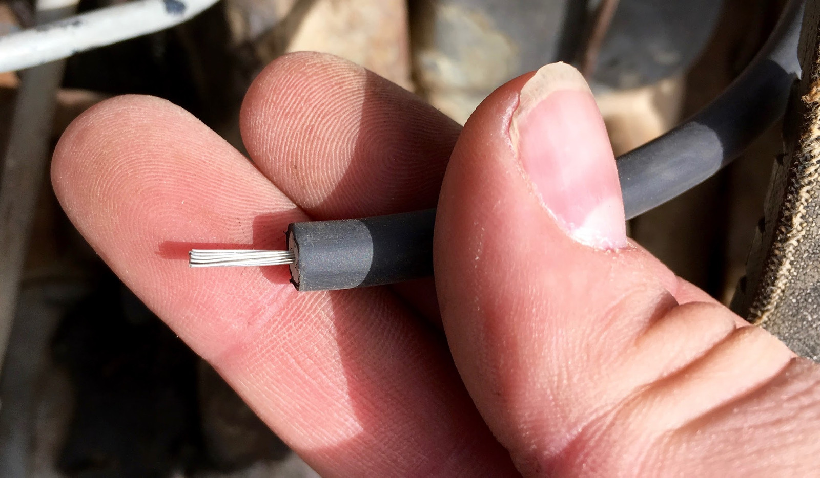 The system installed works, but not particularly well. After taking a look at the positive ground lead, I think I see a few problems here. The battery terminal isn’t in good shape, the wire isn’t in good shape, and the connection to the frame isn’t in good shape.