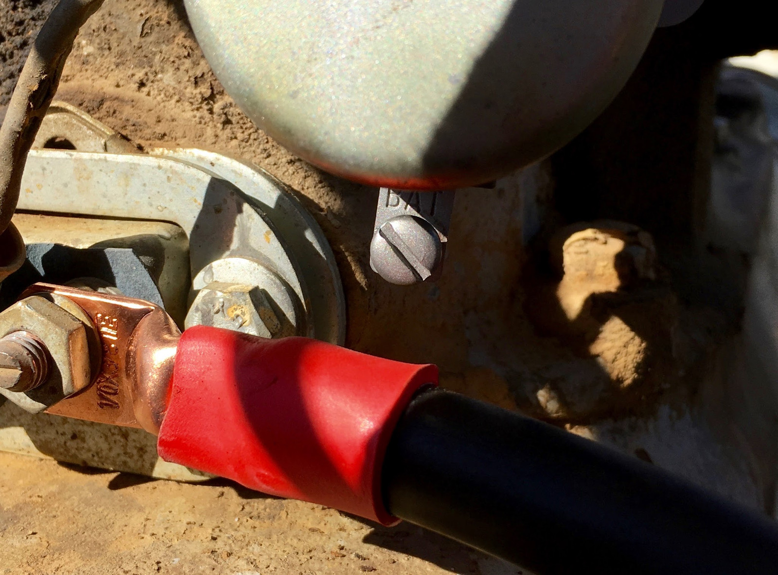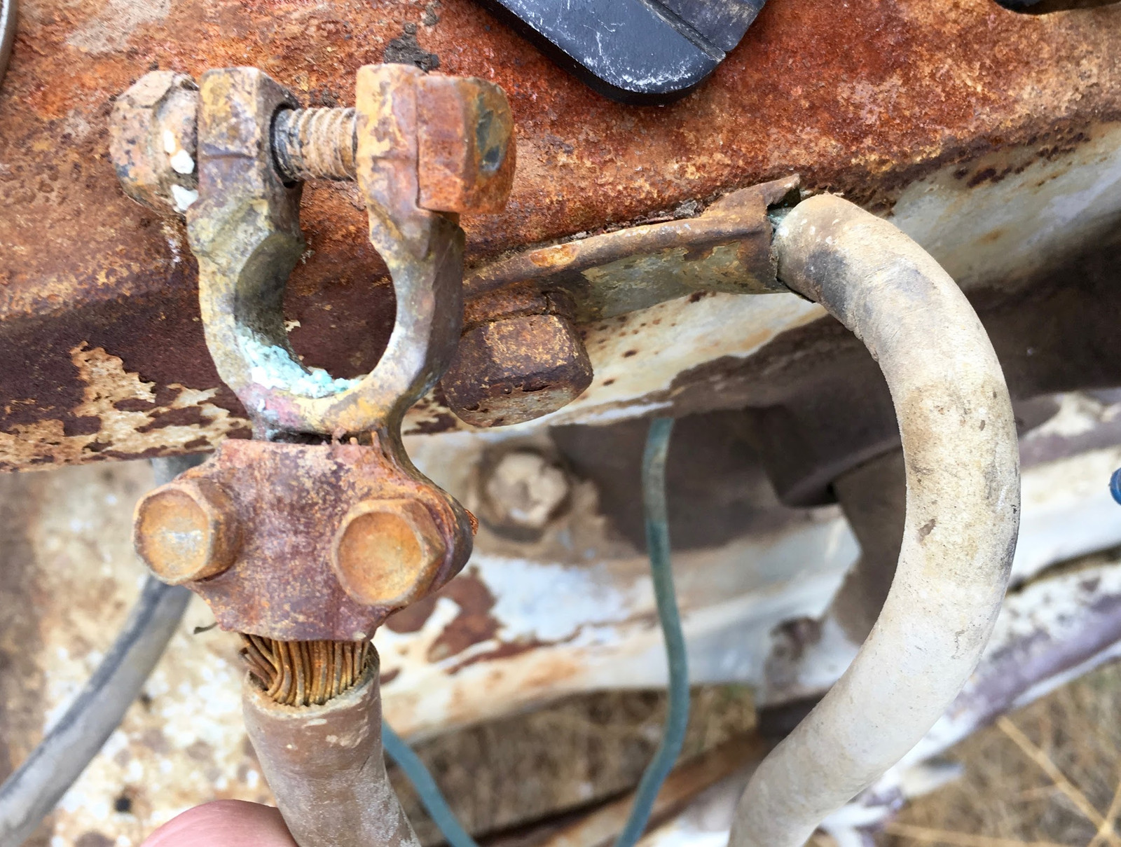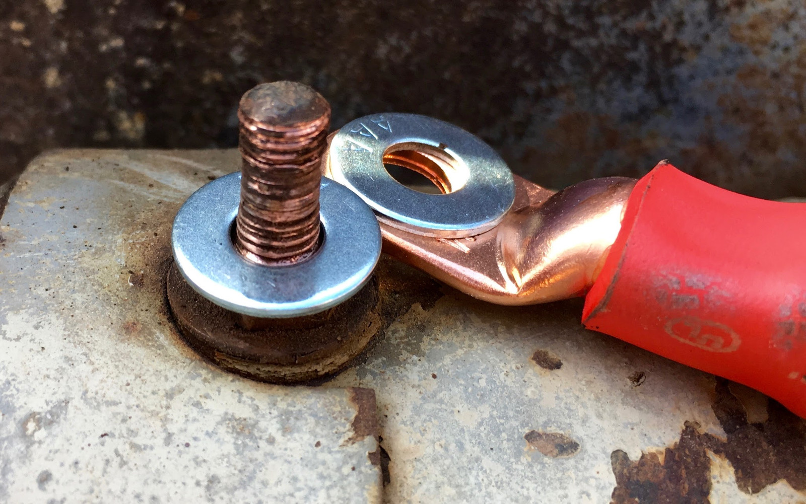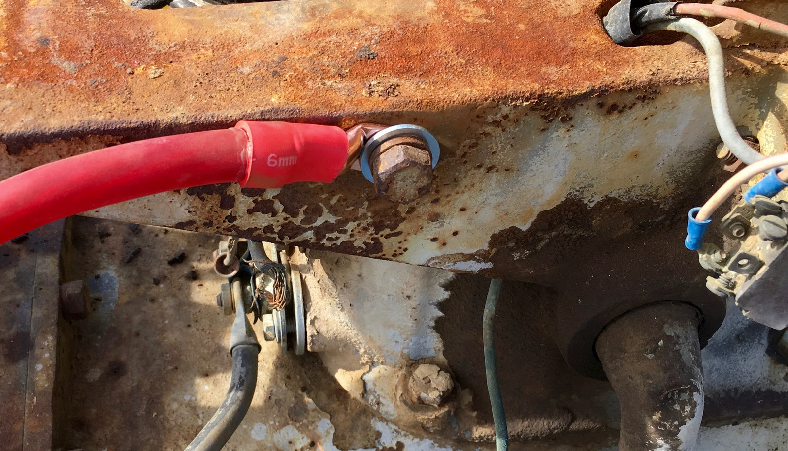A bit of sanding to clean up the rust, a new washer, and I’ve got a positive ground connected!