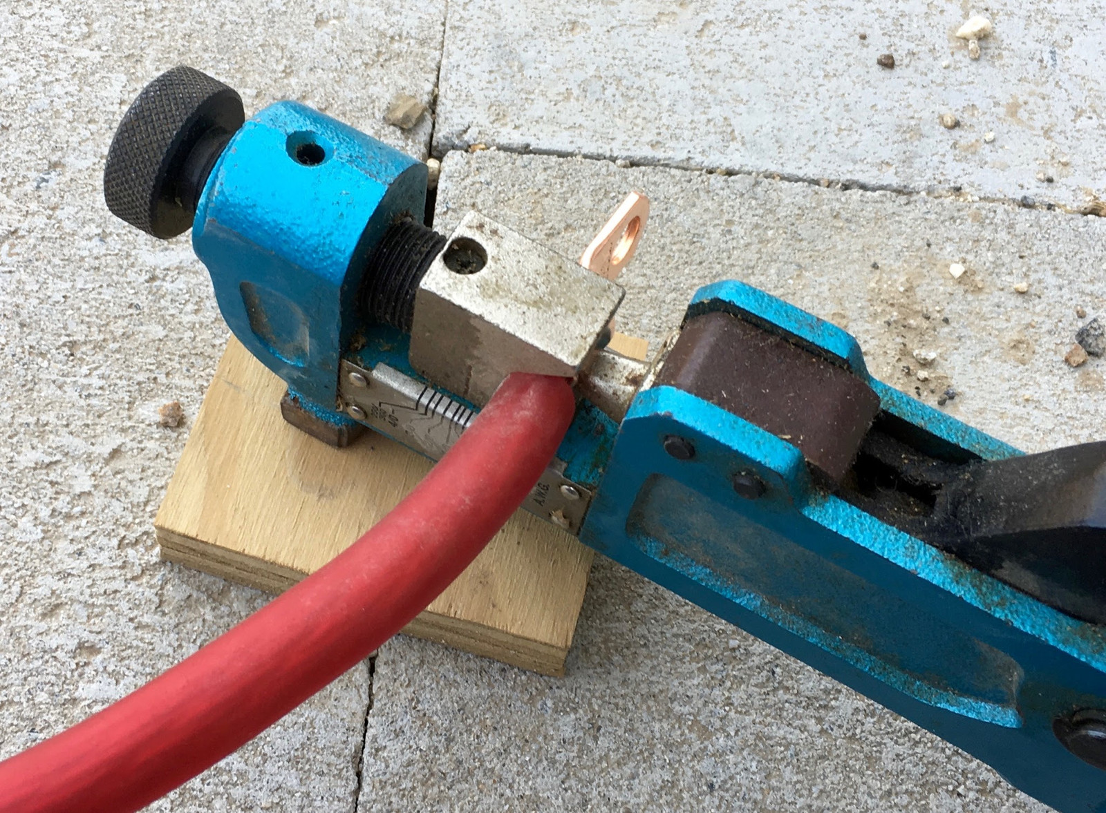 Building new cables isn’t hard if you have a bunch of 0/1 gauge wire laying around and a few copper ends. My wire is from my office battery pack, and I had some terminal ends laying around as well. They’re handy things to have. I also have a massive DC crimper that lets me put enough force on the terminals to properly crimp them. It takes a lot of force, and I can provide it!