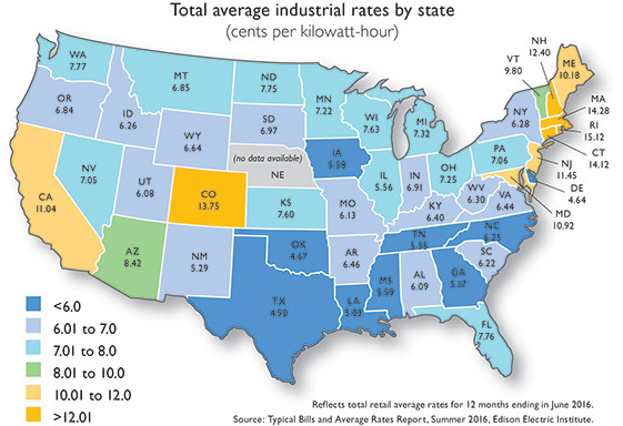 Pacific Power has an Industrial Price Comparison chart with numbers from 2016, and they come out about the same as the above numbers - there are an awful lot of states where you can get grid power cheaply enough for this to work.
