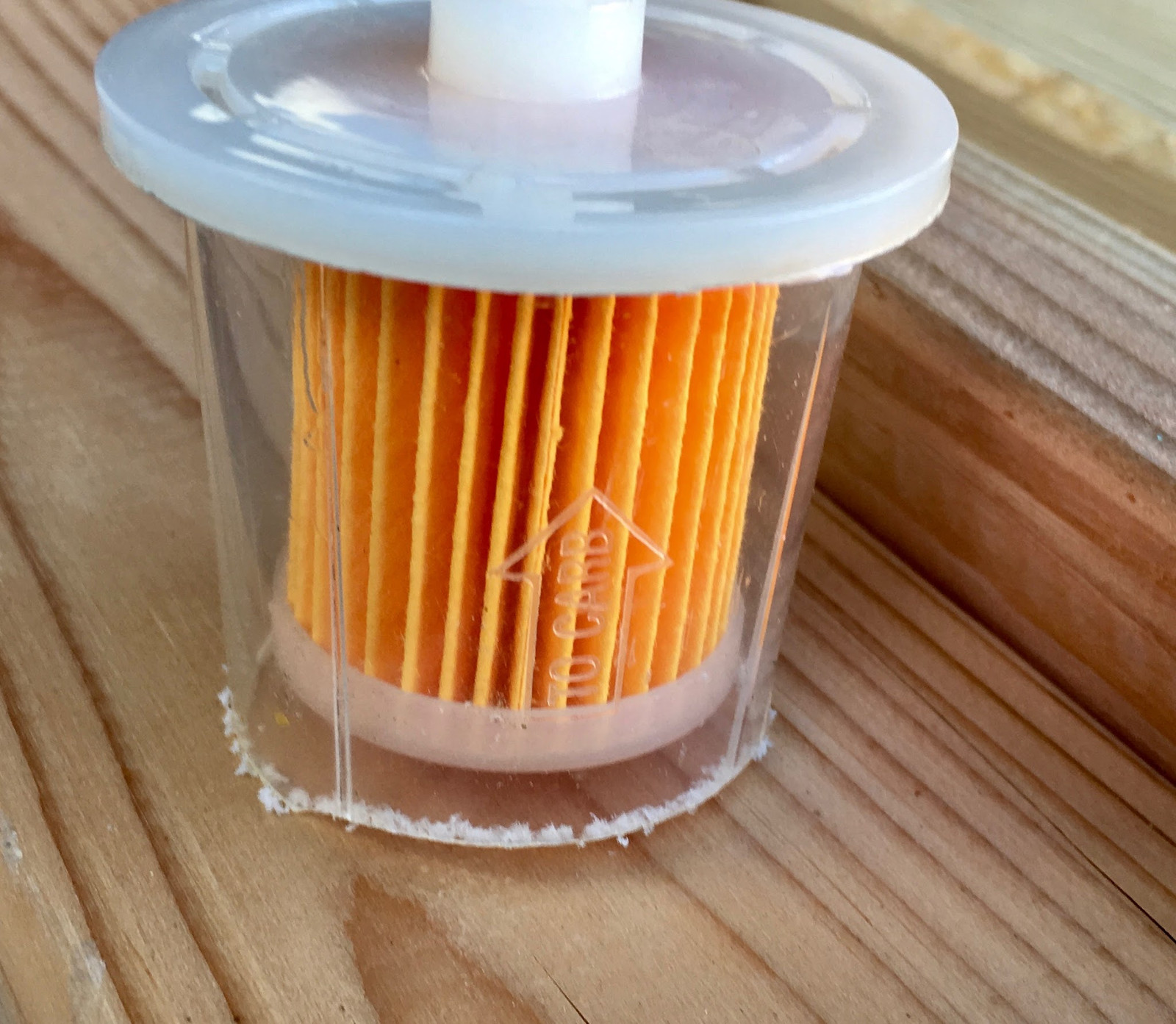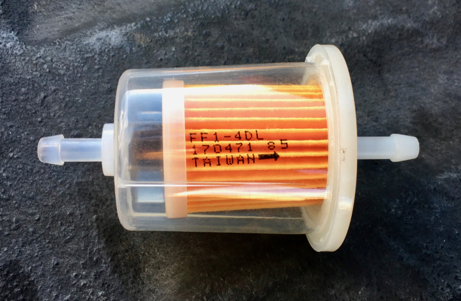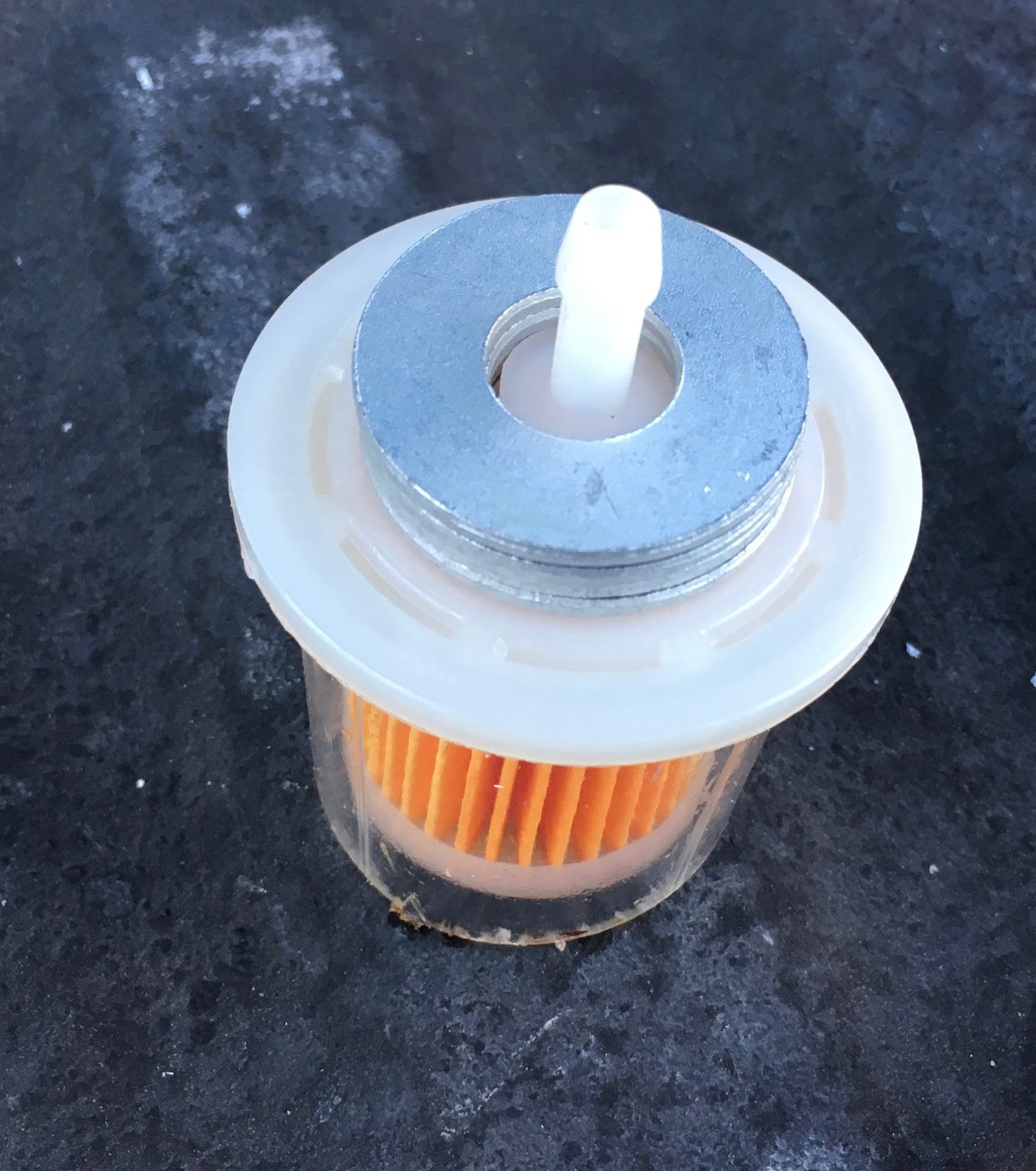 Given the rather unknown history of my tank, I decided to toss a filter on the pickup end to help keep any debris from making it into the (not-quite-as-good) filter in the generator. A bit of digging around my local auto parts store found this helpful looking filter - which I then proceeded to hack up. Notice that the paper element is secured to the outlet side (the right) - I can remove the entire left side of the case and not have the filter fall out or come unsealed or anything.