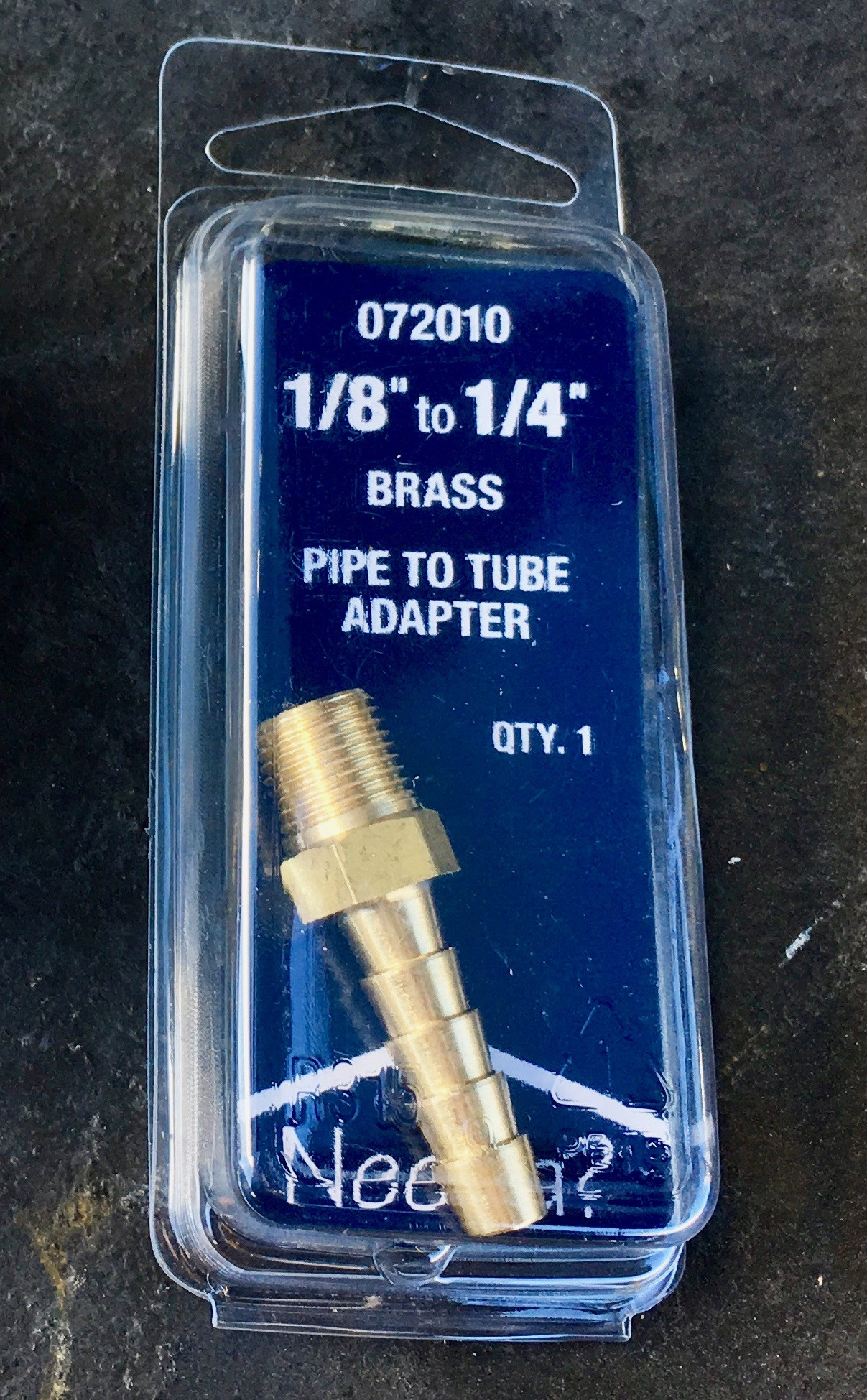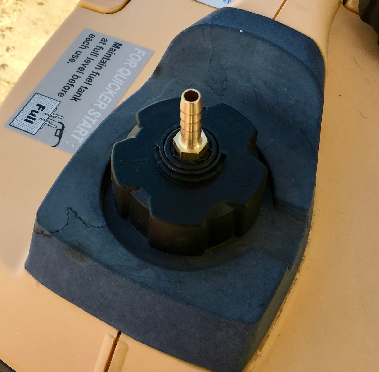 After some measuring and fiddling around at the parts store, I ended up with this handy little adapter. The hose barb fits 1/4” fuel line, and the pipe threads look like they’ll fit my generator cap without much work! This is from AutoZone, but you can find a similar adapter pretty much anywhere. It should run you around $5.