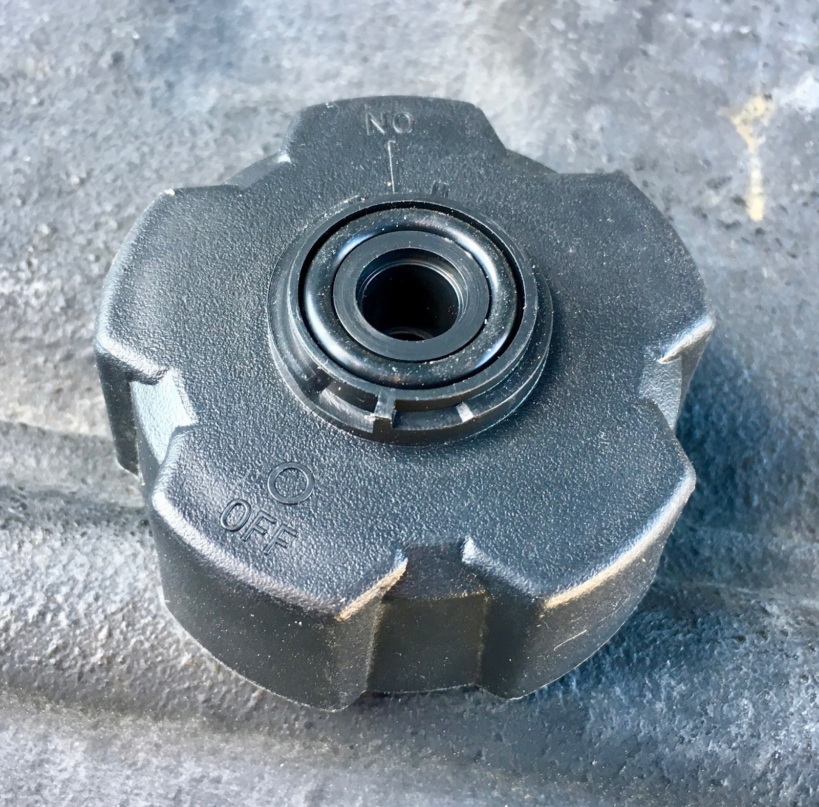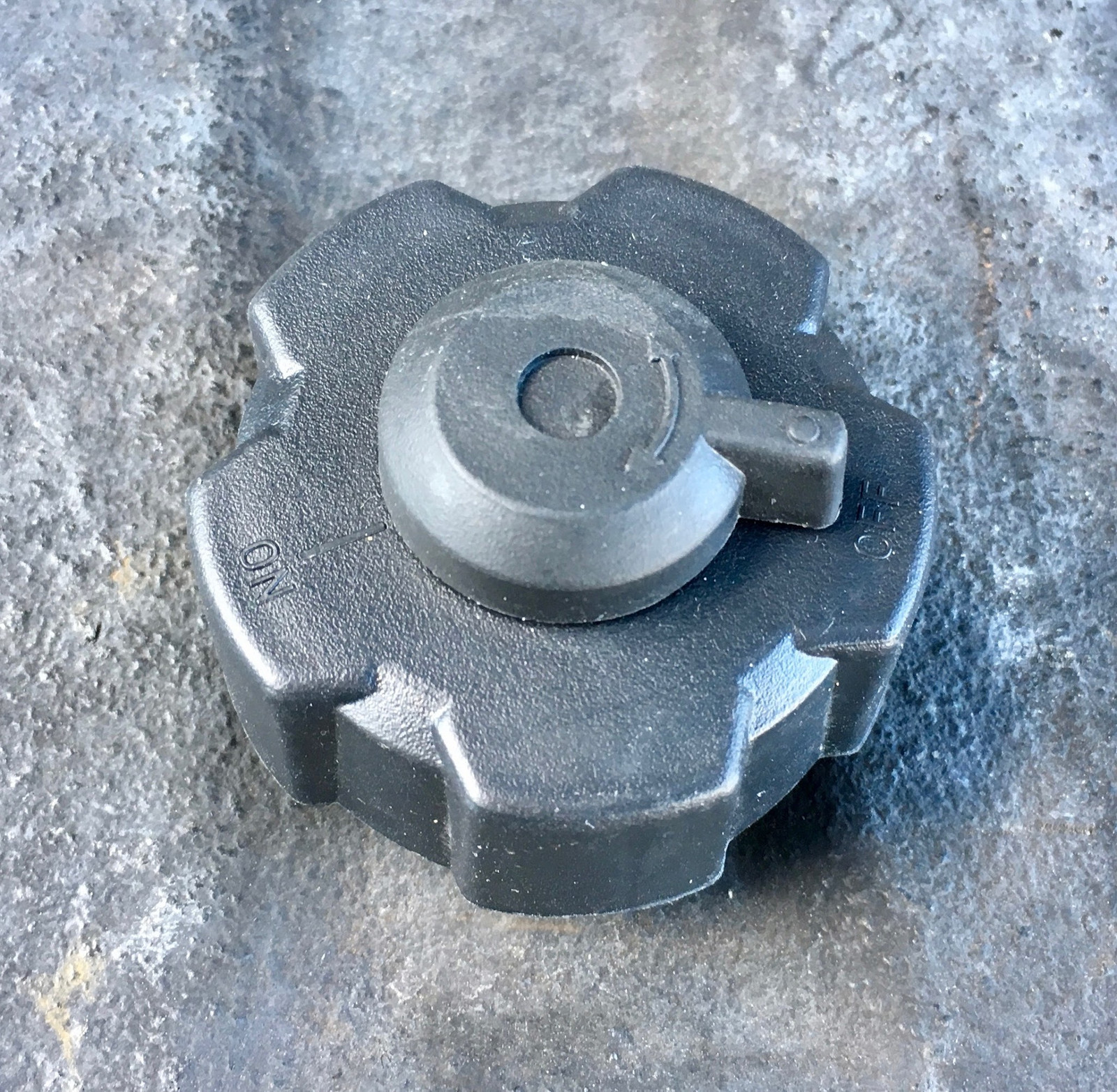 Mine is simple enough - there’s a toggle on the top that switches between “on” and “off.” That just refers to what position the slider needs to be in for generator operation vs storage. This is an air vent for the fuel tank, and if you run the generator with the cap in the “off” position, it’ll stop after not particularly long from fuel starvation, and you’ll hear suction when you open the cap.