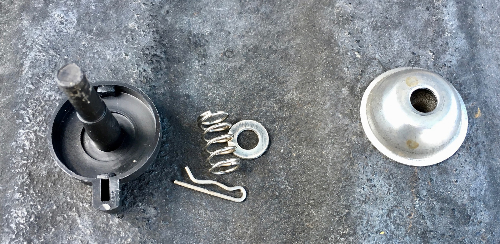 Flipping it over, there’s a metal dish, a spring, a washer, a cotter pin, and the actual plastic shaft. Remove the cotter pin, and the whole thing pulls apart.