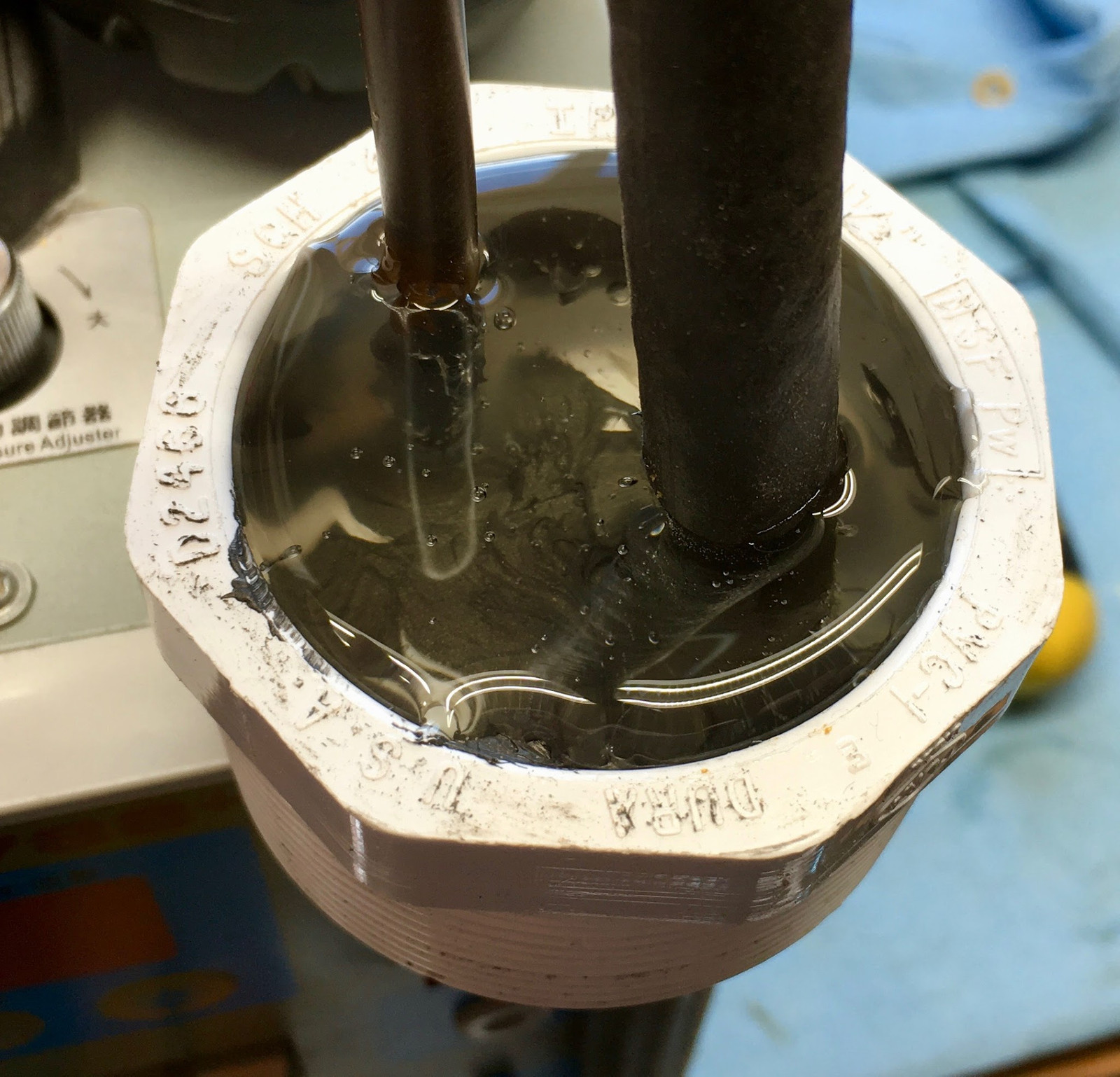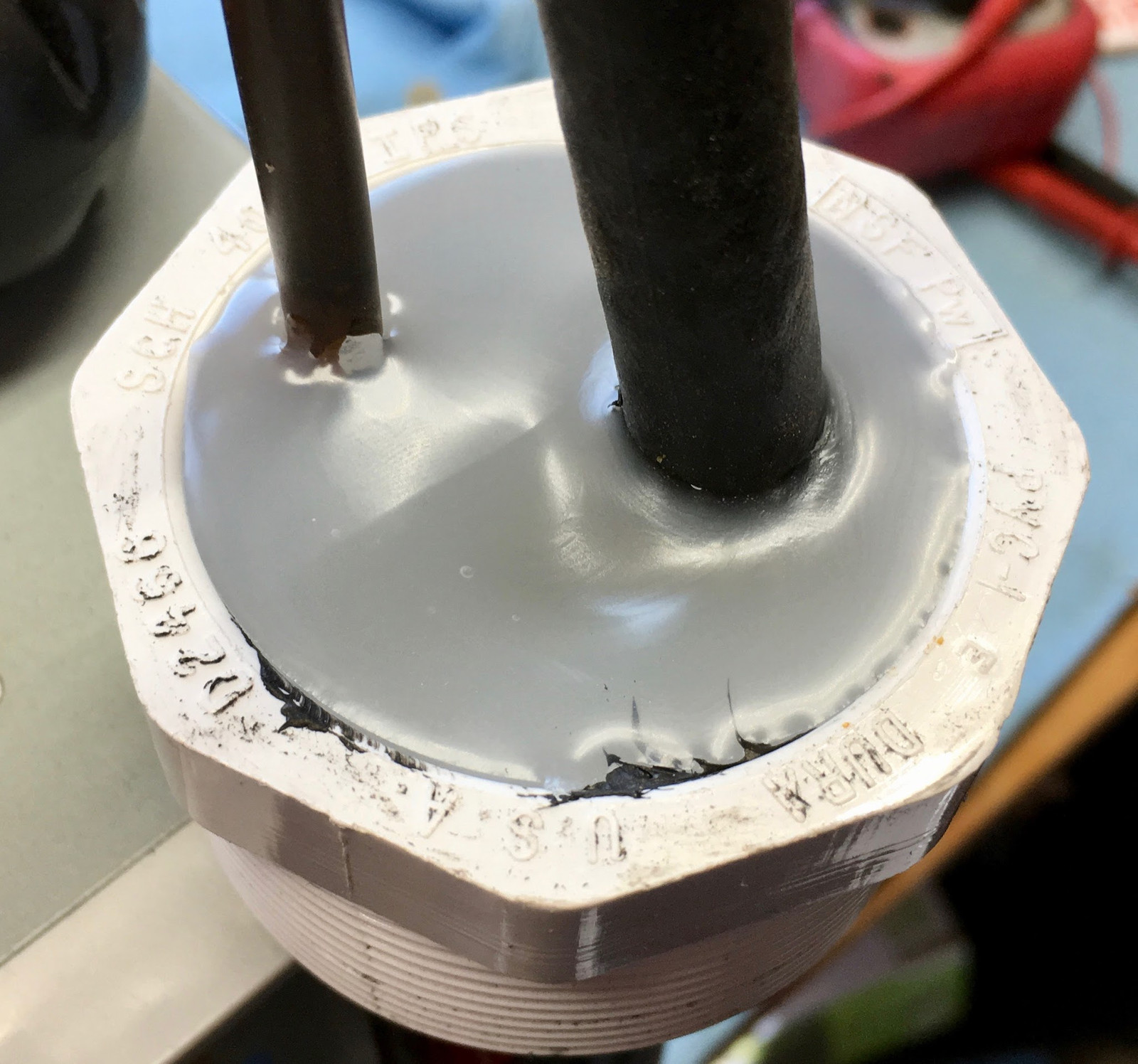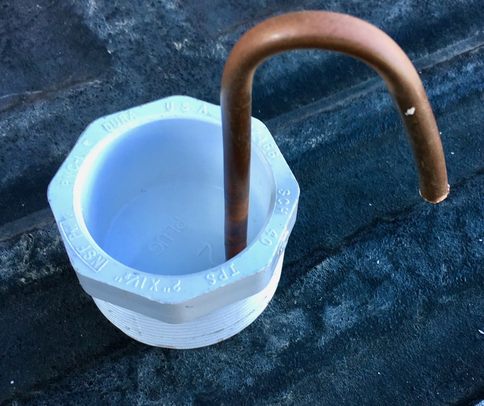 Starting with a 2” PVC pipe cap, I need two holes in it - one for the fuel line, and one for the vent line. I’m closing up the existing vent hole to avoid water infiltration, so I need a vent hole as well - one that won’t collect water or leafcutter bees.