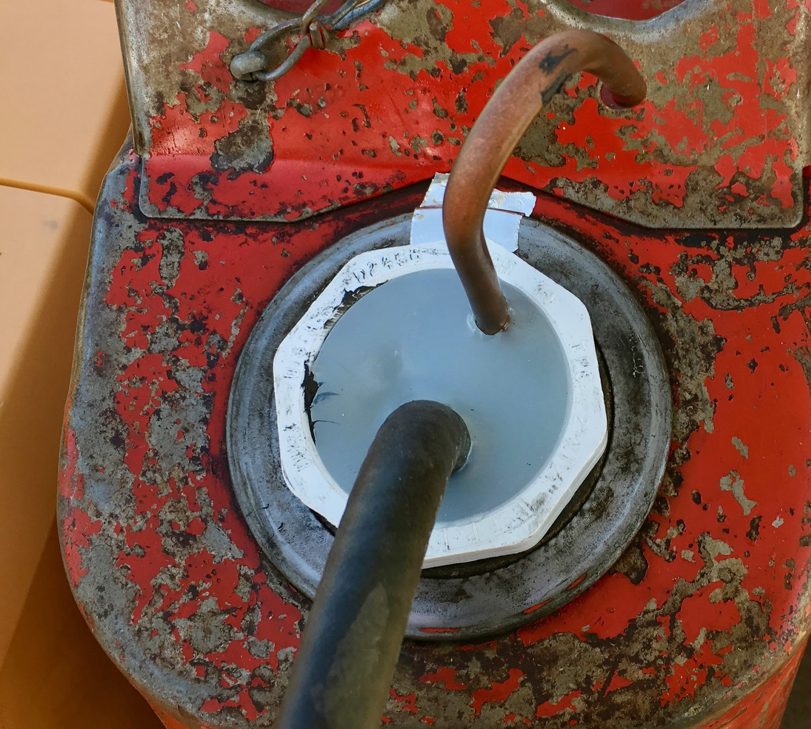 With the generator side cap done, I started on the tank pickup. My extended run tank is an old metal 5 gallon Jerry can I found laying around a relative’s property (I find a lot of useful things there). Old. Metal. Heavy. Solid. Holds gasoline. Good enough for me! The outside is dirty, but the inside is clean enough. I’m still going to put a filter in, just to help in case there is crud floating around. I’m not sure when this was last used, but it has something resembling old gasoline in the bottom. I rinsed it out and filled it - it’s probably fine.