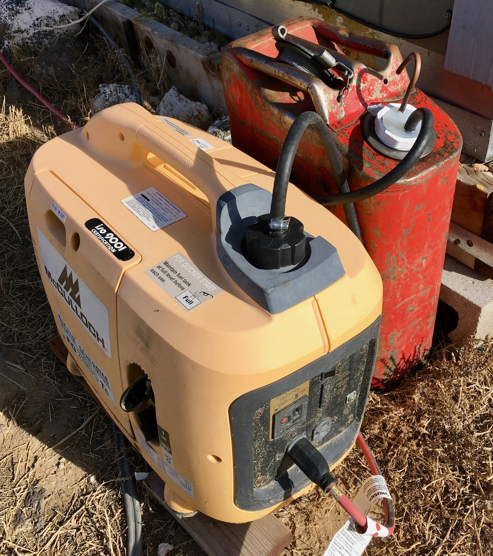With the whole setup connected, I can go through 5-6 gallons of generator fuel between refills! Less mess, less fuss, and I can just let the generator run without worrying about the fuel level in the generator tank. This simplifies my life, and should mean a lot less spilled fuel (I cannot say enough bad things about EPA legal cans).